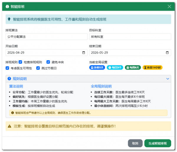 窗外,门诊已接近下班时间。林杰看着屏幕上的第3版排班表,知道今天还得再调一次。他想:如果能有个系统,把所有这些复杂规则预设进去,自动检测冲突,医生手机端申请请假换班,主任一键发布……那该多好。